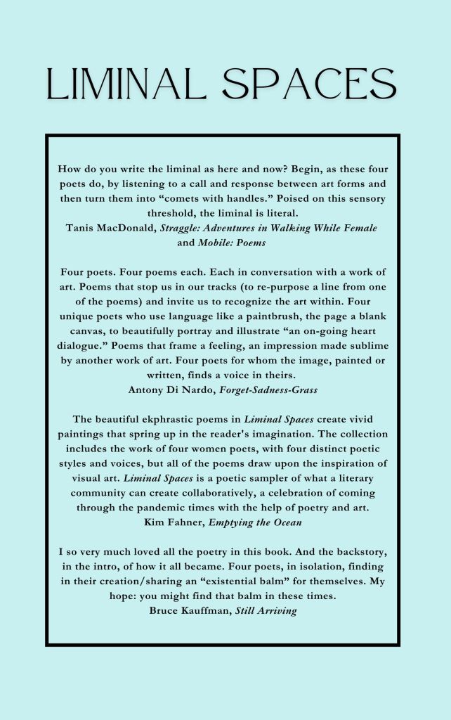 This small collection of ekphrastic poetry is one of the results of a five year collaboration of the poets listed on the cover, who began to meet regularly on Zoom to discuss our poetic interests and our own writing five years ago. It became a successful effort to lessen the isolation of the pandemic. It will soon be available in local book stores and can be ordered by email from the authors.