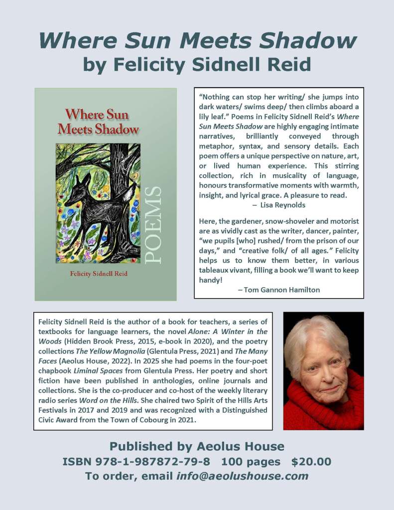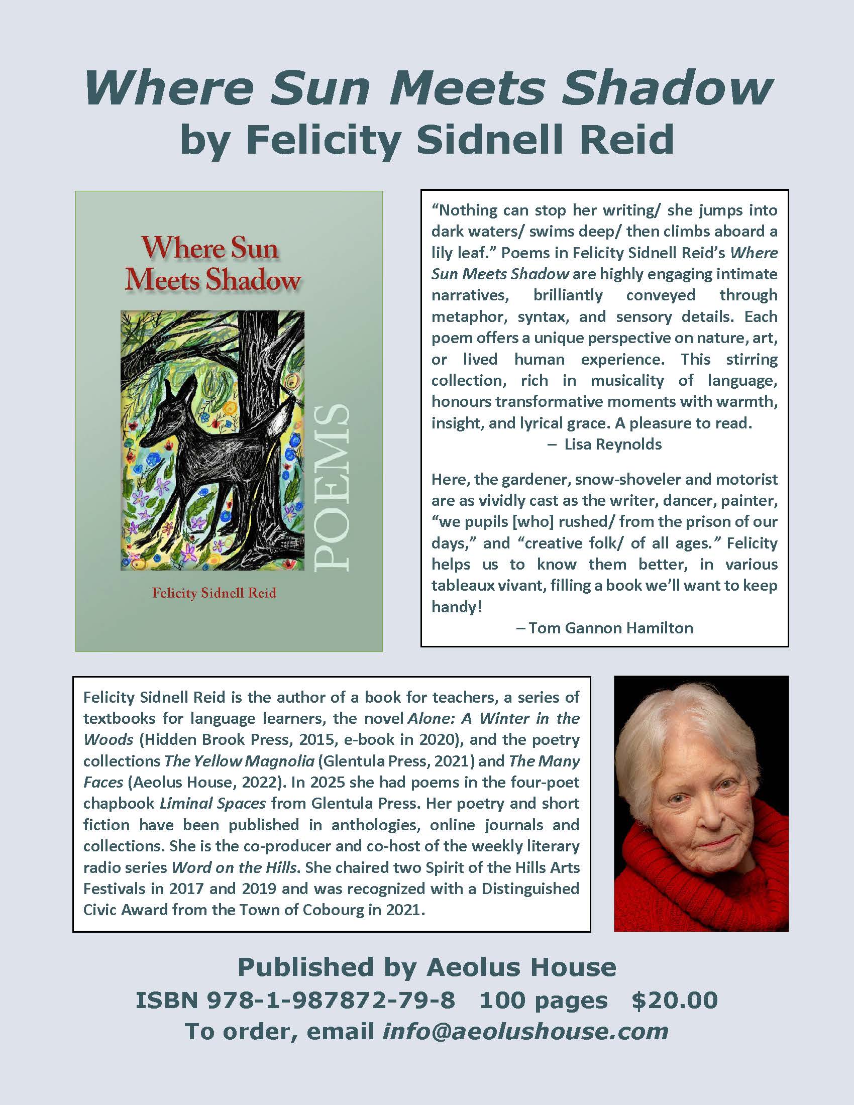 WHERE SUN MEETS SHADOW I am happy to announce the publication of my new collection, Where Sun Meets Shadow with Aeolus House. The book will be released in March and launched on March 22nd at Readers’ Nook in Cobourg. (details to follow) Share this: Share on X (Opens in new window) X Share on Facebook (Opens in new window) Facebook Like Loading...